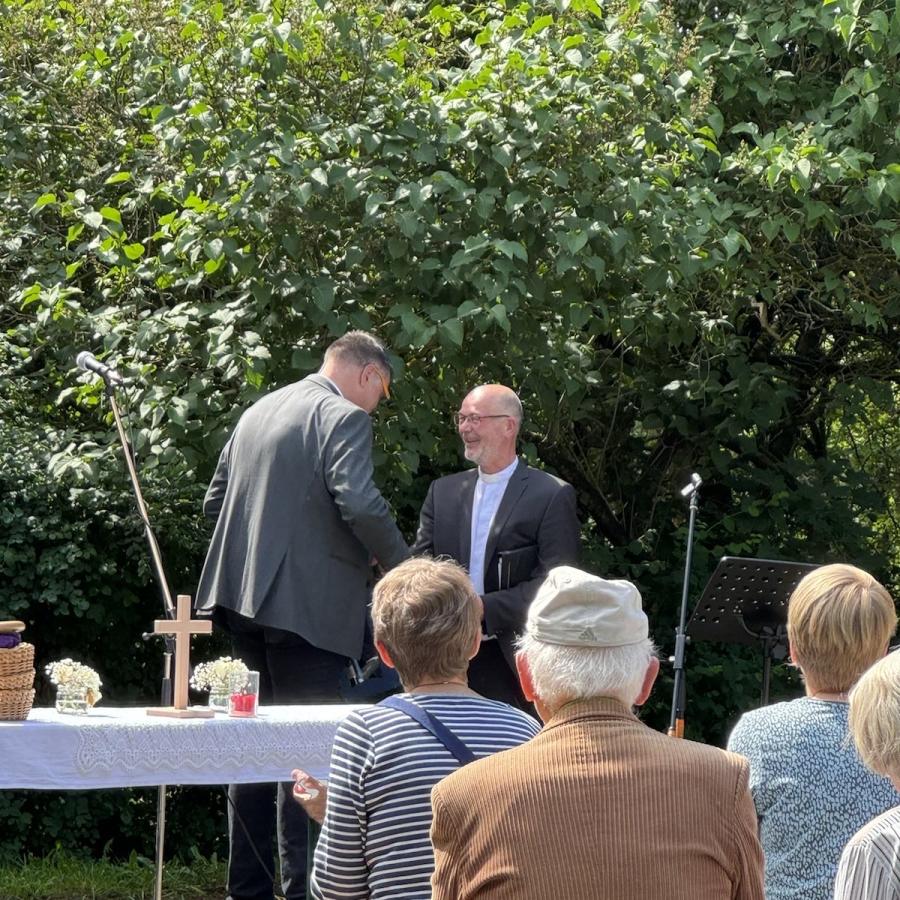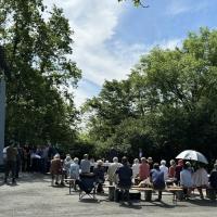 Von den Wettervorhersagen vielleicht verunsichert, kamen in diesem Jahr ein paar weniger Menschen aus den Gemeinden Markus-Paulus und Erlöserkirche zum Open-Air Gottesdienst auf dem Bärenstein zusammen.